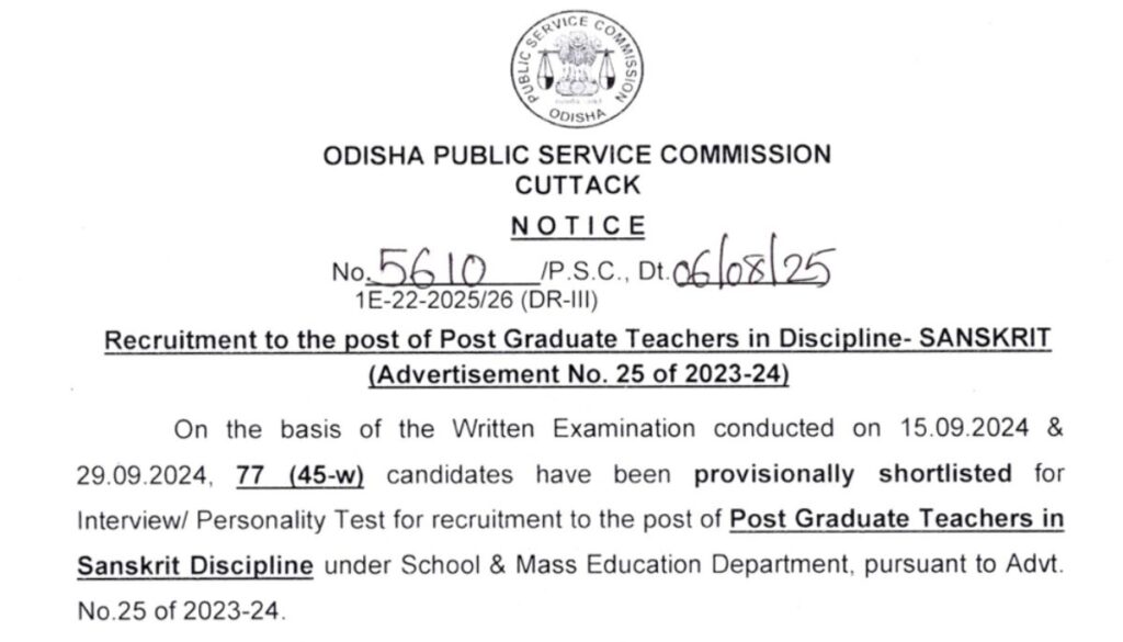 The Odisha Public Service Commission (OPSC) has officially published the shortlist of candidates for the recruitment of Post Graduate Teachers (PGT) in Sanskrit Discipline under Advertisement No. 25 of 2023-24.